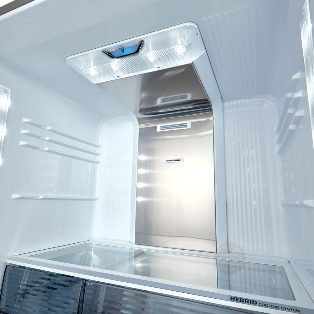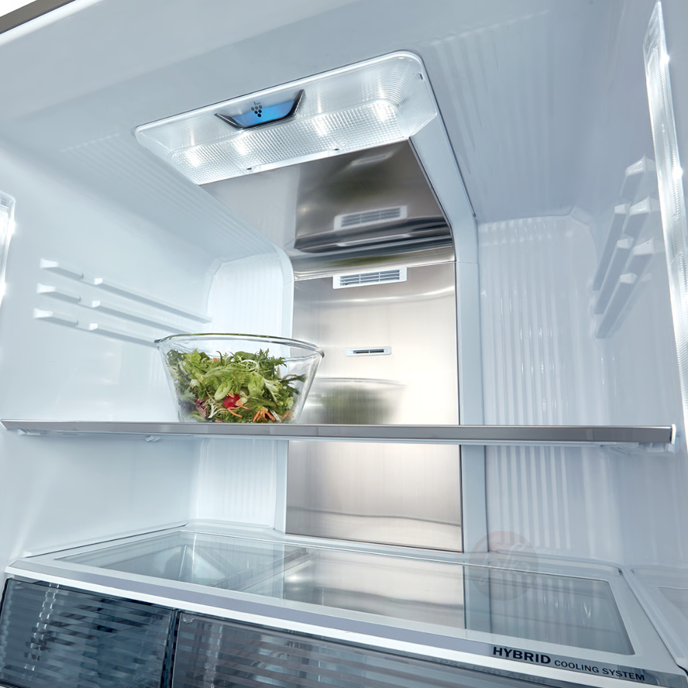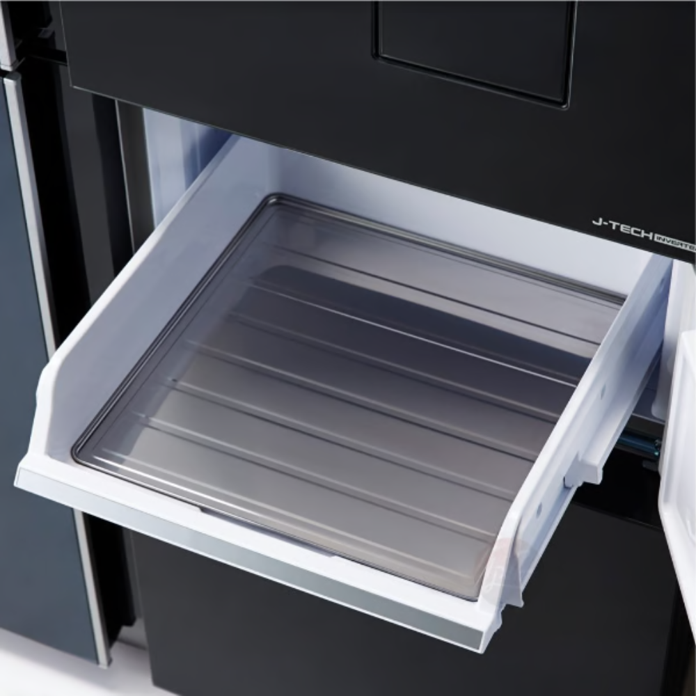 מנוע J-Tech Inverter חסכוני באנרגיה עם התאמת מהירות המדחס לתנאי השימוש. טכנולוגיית ActiFresh Hybrid Cooling לקירור אחיד ושמירה על לחות, מערכת Plasmacluster ion לנטרול בקטריות וריחות ושמירה על טריות המזון. מגירת מצוננים (0°C) אידאלית למוצרי חלב, בשר ומשקאות. תא אחסון גמיש עם 4 מצבים – קירור, הפשרה, קירור חזק וקירור מהיר.