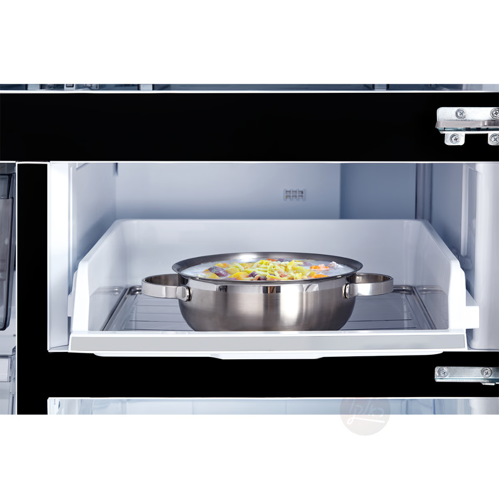 תא קירור – חלל פנימי ענק ללא מחיצה, 2 מדפי זכוכית נשלפים, מדף זכוכית קבוע, 2 חצאי מדפים, 2 מגירות לפירות וירקות, מגירת צינון (-3°C), מגירת צינון PCI.